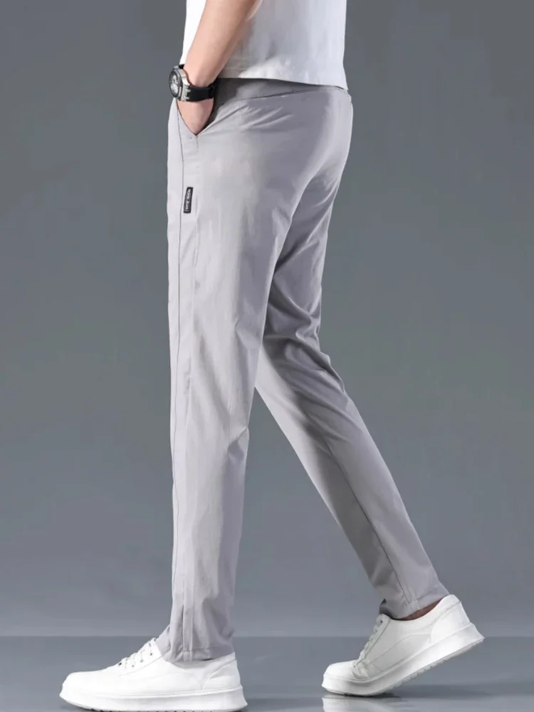 Men's casual pants, semi elastic waistband, nylon ice silk elastic straight tube, light gray, business gentleman, summer casual